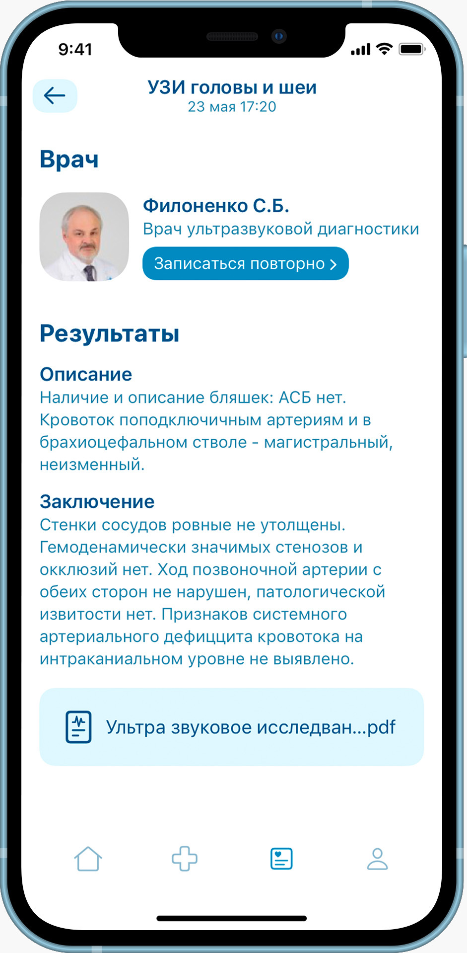 Оперативный доступ к информации о состоянии здоровья и расшифровкам результатов обследований – больше не надо хранить бумажные записи после каждого осмотра, ведь вся информация всегда под рукой.